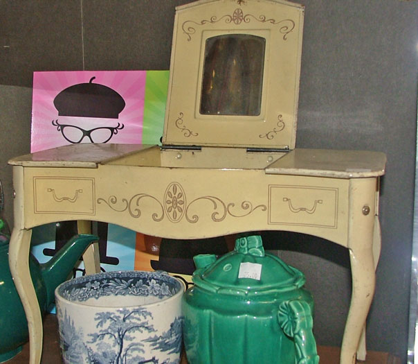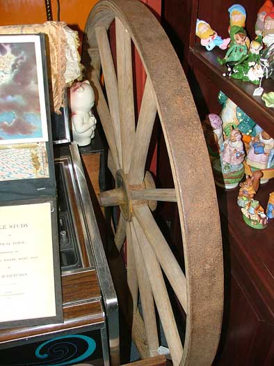 You might notice in our slideshow two unique pieces. One is a stick horse which requires actually walking/running around pretending you’re riding a real horse. Hey, exercise that’s fun! The other is a huge wagon wheel. Why? I don’t know, just seemed to fit with horses. One is all metal; the other is wood with a flat metal tire. These are large wagon wheels at least 3 feet in diameter. Can you come up with a unique upcycle?