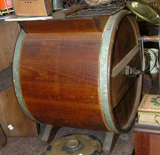 Did you notice the clothes washer? It’s a 1950s electro mite portable, electric, washing machine. The tub holds 4 gallons of water and sits in the base that is a motor that agitates the tub, washing the clothes. That’s it – add a bit of detergent to the water, add clothes, plug in and agitate – easier than a washboard!