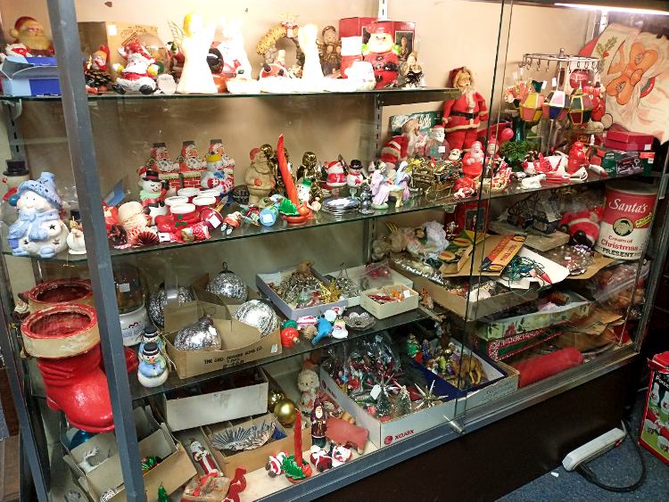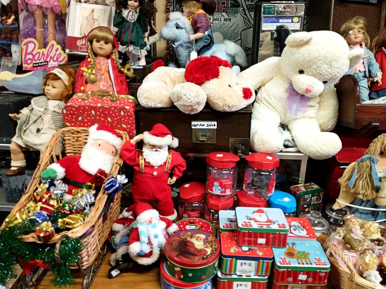 It’s been George’s tradition to decorate the weekend following Thanksgiving. But this year, the hundreds of dolls he acquired meant that he had to move a lot of things around ASAP!!! So the windows are decorated a couple of days early – yes, thanks, Barbara. And Christmas can be spotted throughout the store.