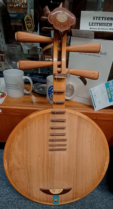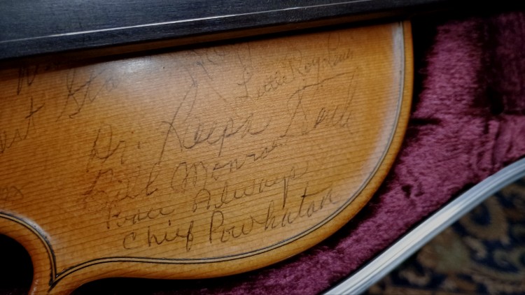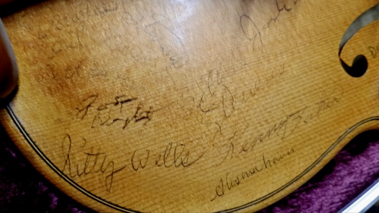 The collection features a violin with many autographs including Kitty Wells, Bill Monroe, and Chief Powhatan. There are several violins including a 15″ student size and a twin set, and a Chinese Moon Lute or Moon Guitar.