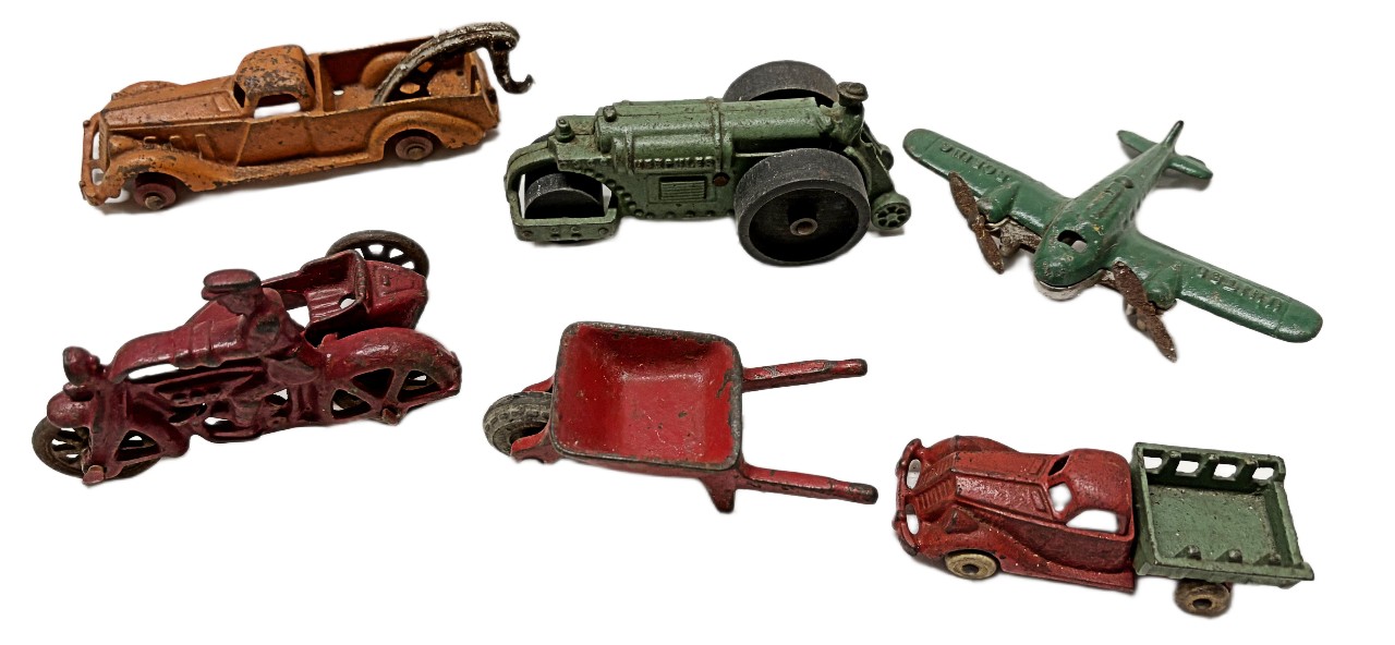 1930s cast iron vehicles by Hubley. Wheel Barrow is Arcade. Available at BAHOUKAS ANTIQUE MALL in Havre de Grace, MD