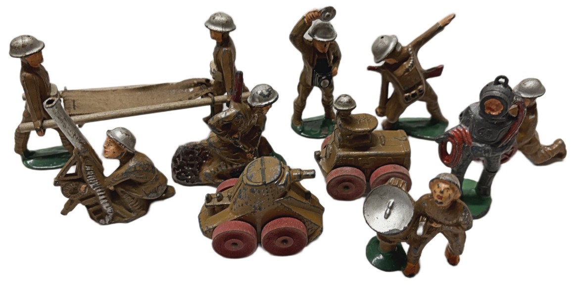Barclay’s pre-war figures are easily recognized by their separately cast World War I-style tin helmets and their distinctive half-moon eyelids. They depict American soldiers on the march or in combat. A smaller group of metal figures, representing civilians, included cowboys, ice skaters, railroad passengers, and station personnel. Occasionally the company was influenced by world events: it issued Italian and Ethiopian combatants when Mussolini invaded Ethiopia, and Chinese and Japanese soldiers during the 1937 Manchurian campaign. Barclay’s enormous popularity is indicated by the expansion of its work force from a few dozen in 1934 to four hundred just before the Second World War, when the firm was turning out several million castings a year.