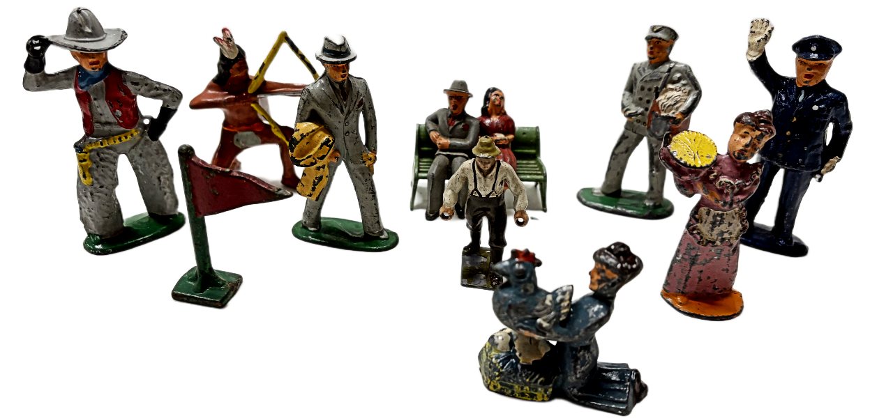 Wonderful variety of leaded figures by Barclay and Manoil including cowboy, couple on bench, policeman, mailman and more.. Available at BAHOUKAS ANTIQUE MALL in Havre de Grace, MD